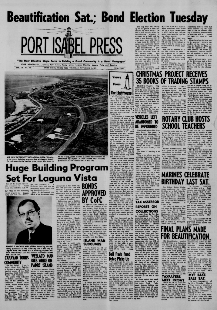 Thirty two years later, in its November 12, 1970 issue, The Port Isabel Press reported “The original townsite of Laguna Vista included a total of 400 acres and development thus far consists of 106 permanent homes, a 6,000 (linear) foot seawall abutting the Laguna Madre and all basic utilities such as streets, power, water and sewer.” The article continued “The small community also has its own fire and police protection and a Marina which can accommodate 35 craft.”